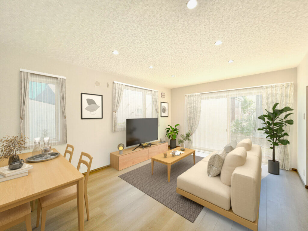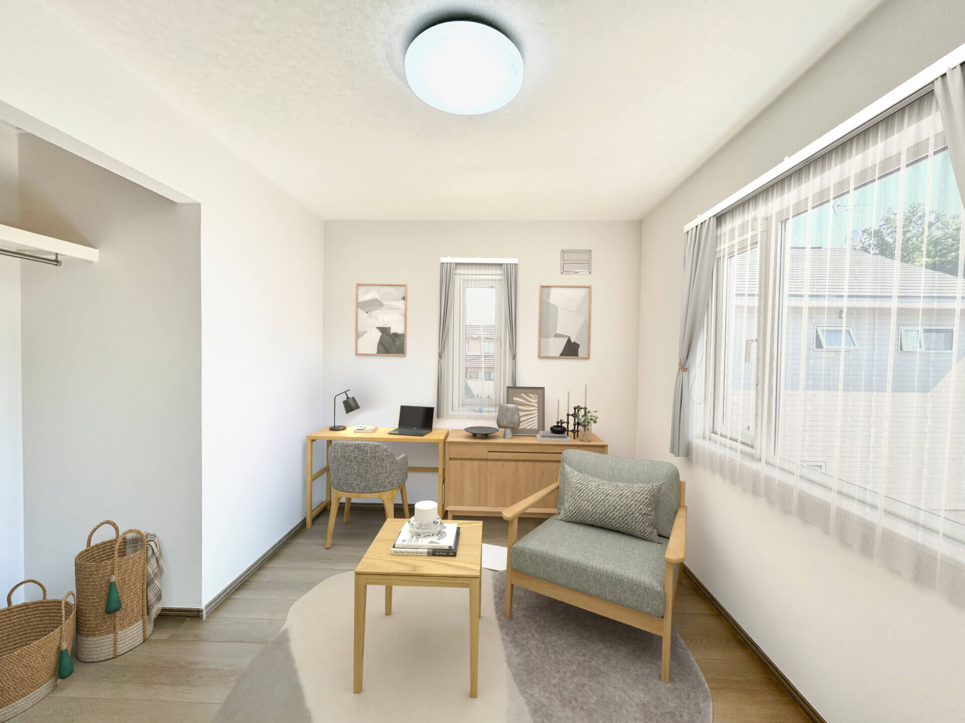 自然光の入り方やお部屋の持つ雰囲気を大切にしながら、明るく清潔感のあるコーディネートに仕上げました。実際に住んだときの心地よさを想像しやすいよう、色味はやさしいトーンで統一。家具はCGで再現していますが、よりリアルに暮らしが思い描けるよう細部まで丁寧にデザインしています。「ここに住みたい」と感じてもらえる空間を目指しました。