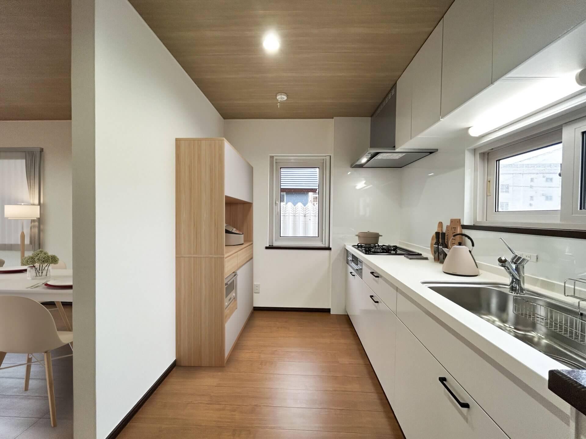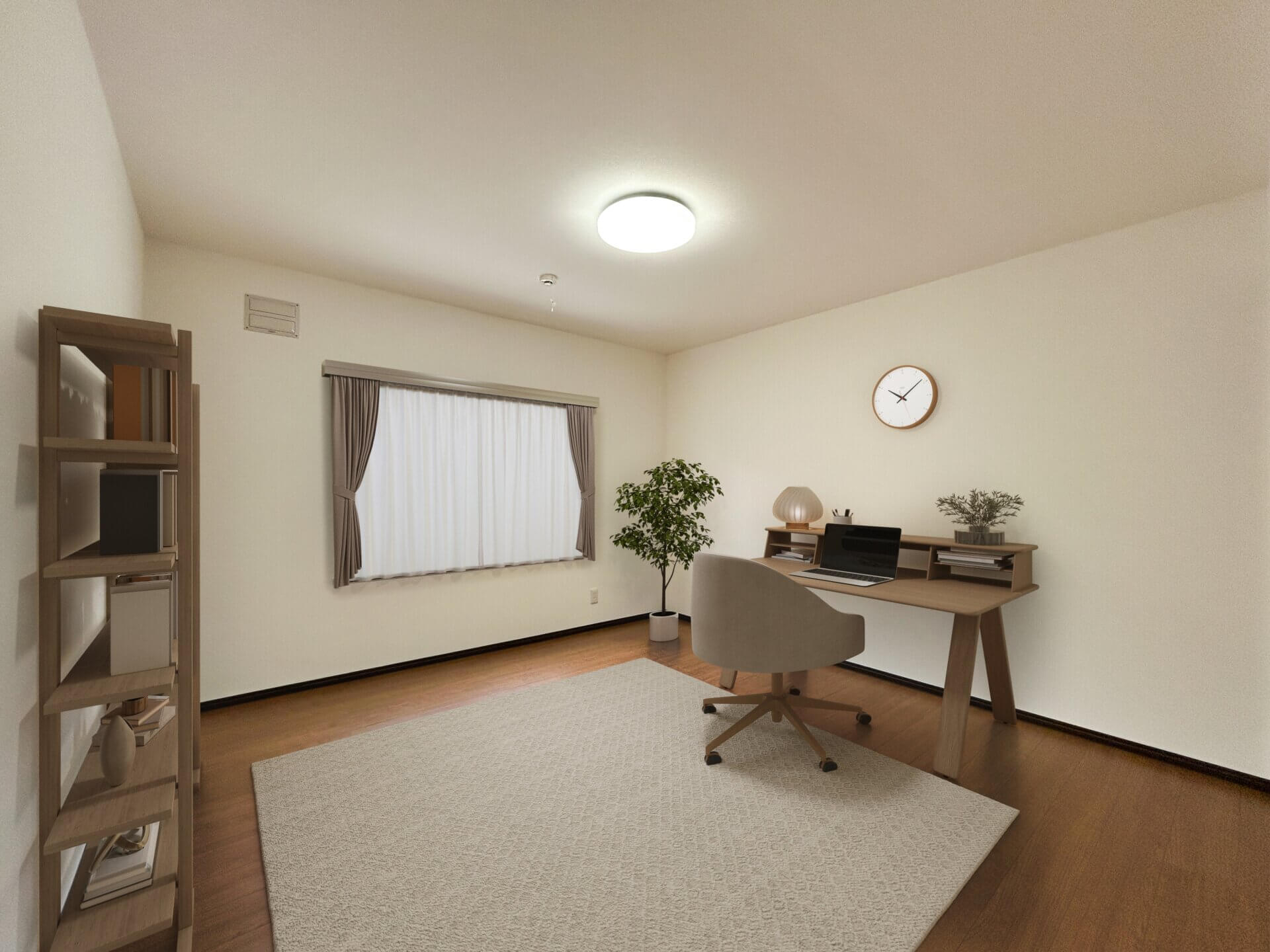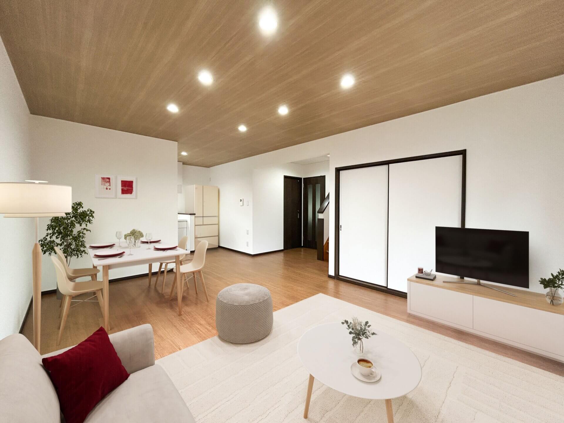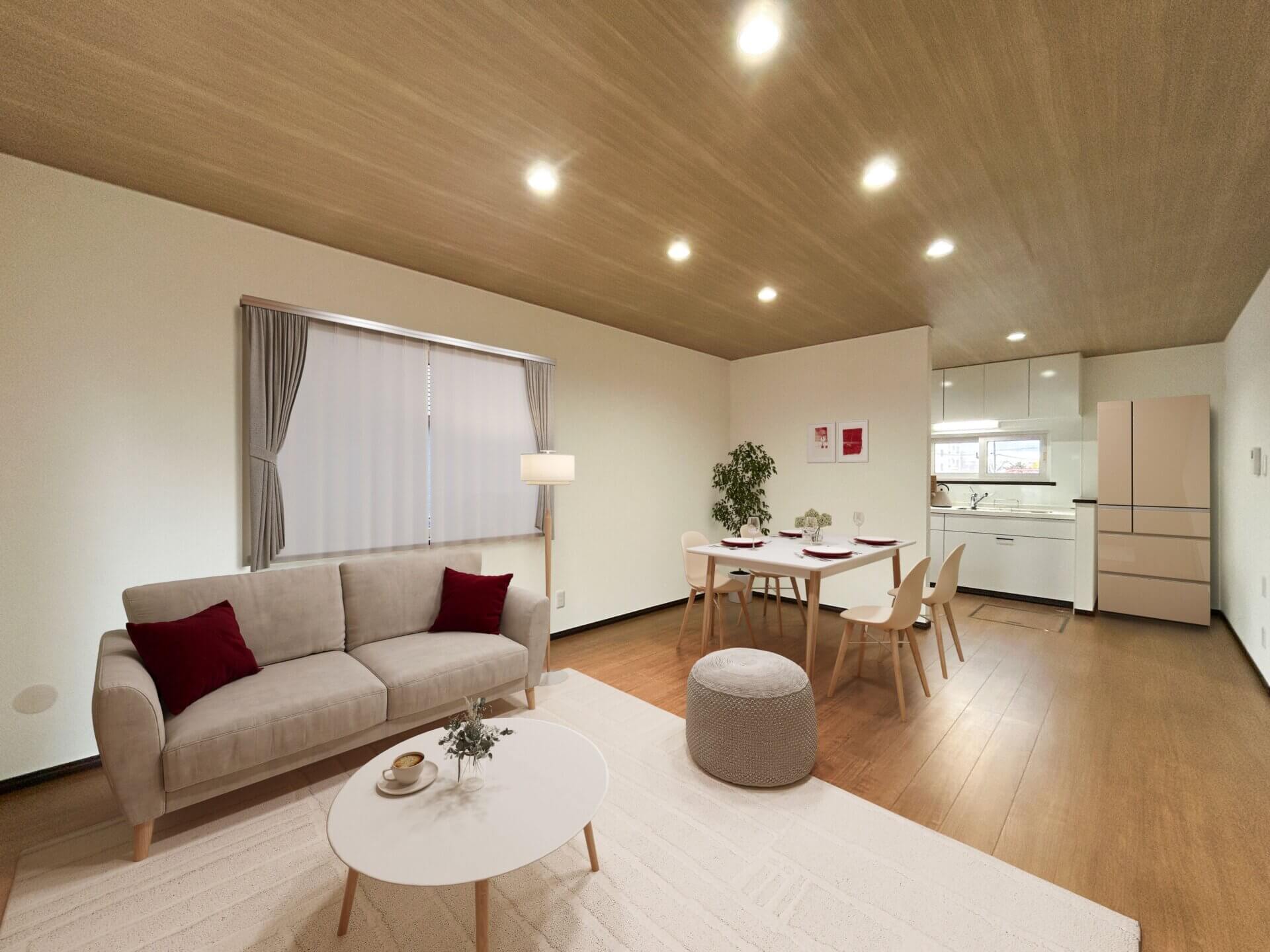 木目天井とナチュラルな床材を組み合わせ、空間全体にあたたかみと広がりを感じられる住まいに仕上げました。LDKは視線が抜けるレイアウトとし、日常の動線にも配慮。シンプルながらも暮らしのシーンが思い浮かぶよう、家具・インテリアはCGにてコーディネートしています。