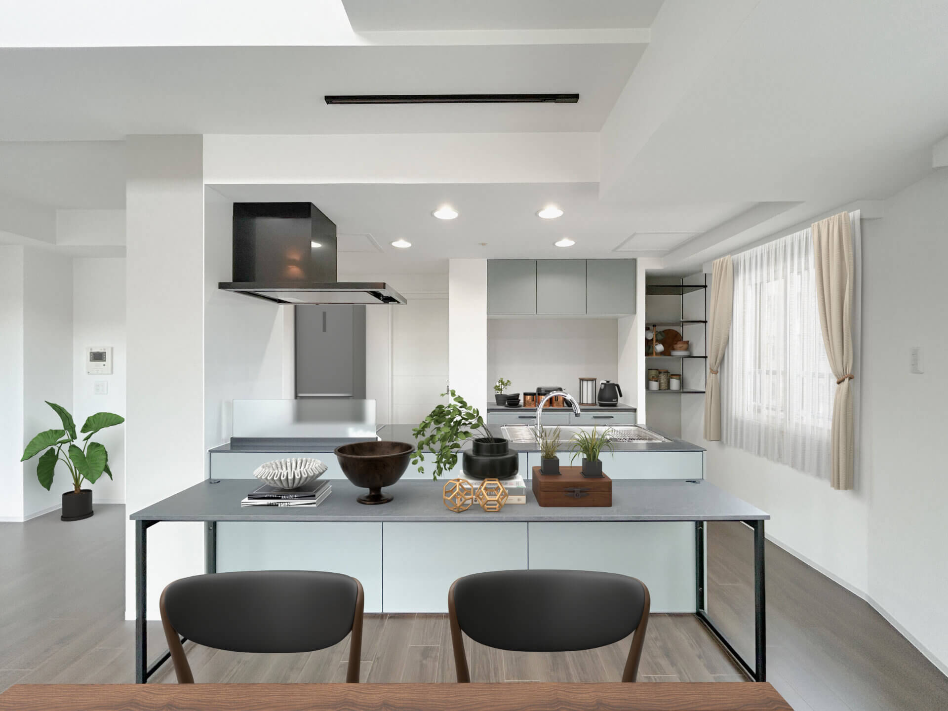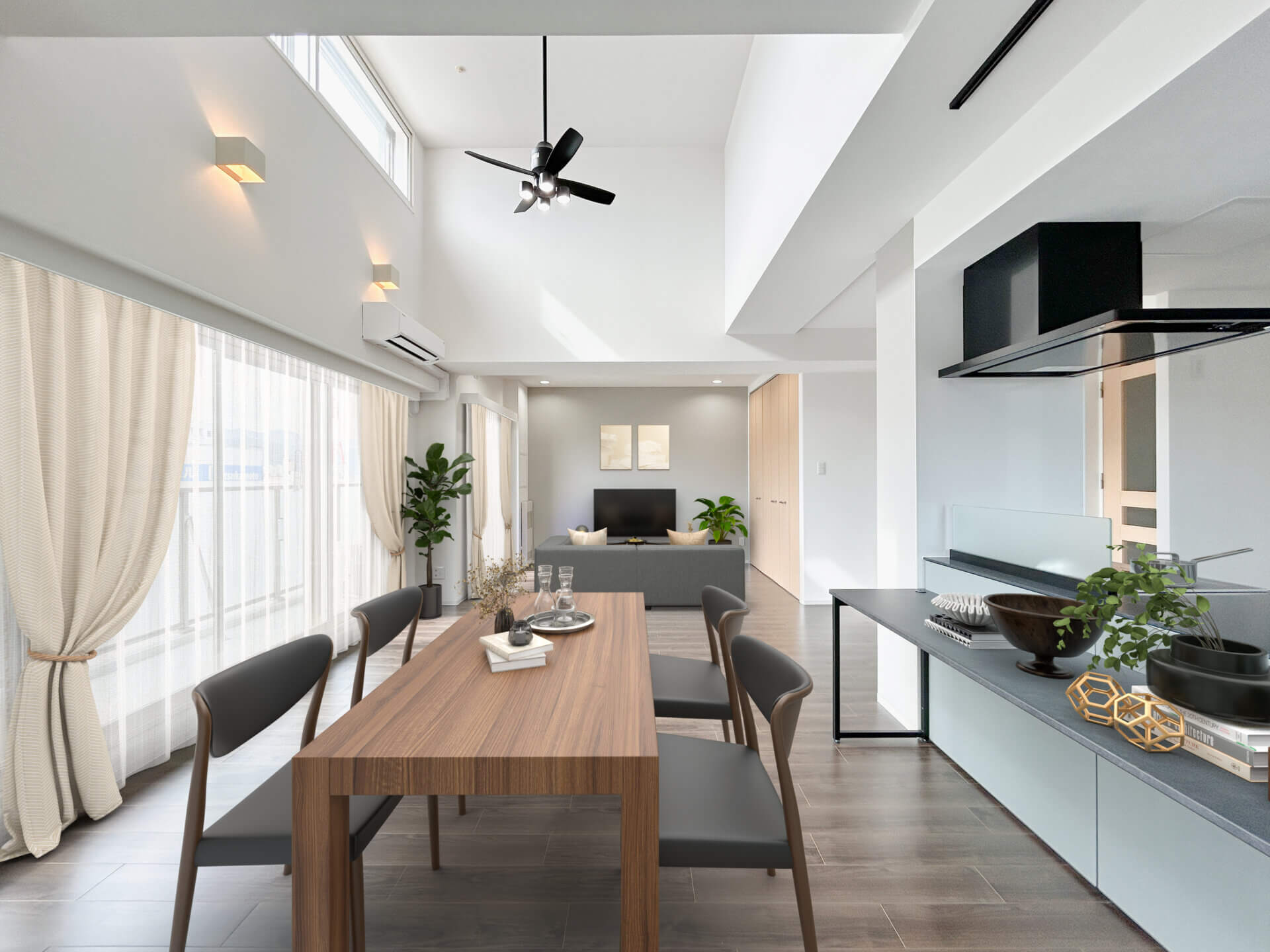 開放的な吹き抜けを活かし、白とグレーを基調としたモダンな空間へ刷新しました。キッチンは吊戸棚を排して開放感を高め、背面にアクセントカラーを配置して洗練された印象に。水回りもダークトーンのパネルでホテルライクに仕上げています。なお、お部屋のイメージを彩る家具や小物はCGによるスタイリングです。
