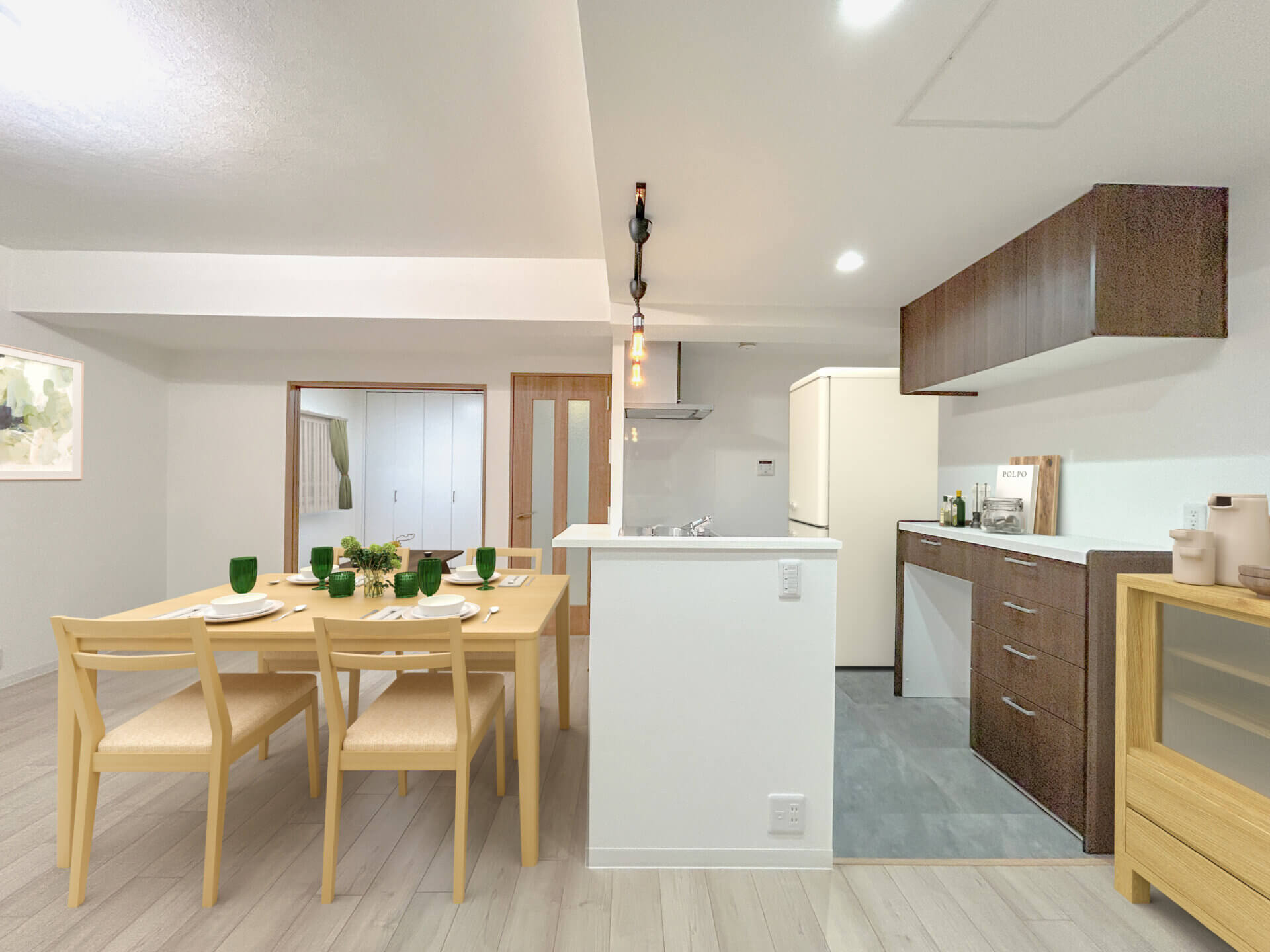 間取りの開放感にこだわりました。キッチンの吊り戸棚をなくし、ペンダントライトでアクセントを加えることで、カフェのような明るくナチュラルな雰囲気に仕上がっています。マンションリフォームのご相談も、お気軽にご相談くださいませ!