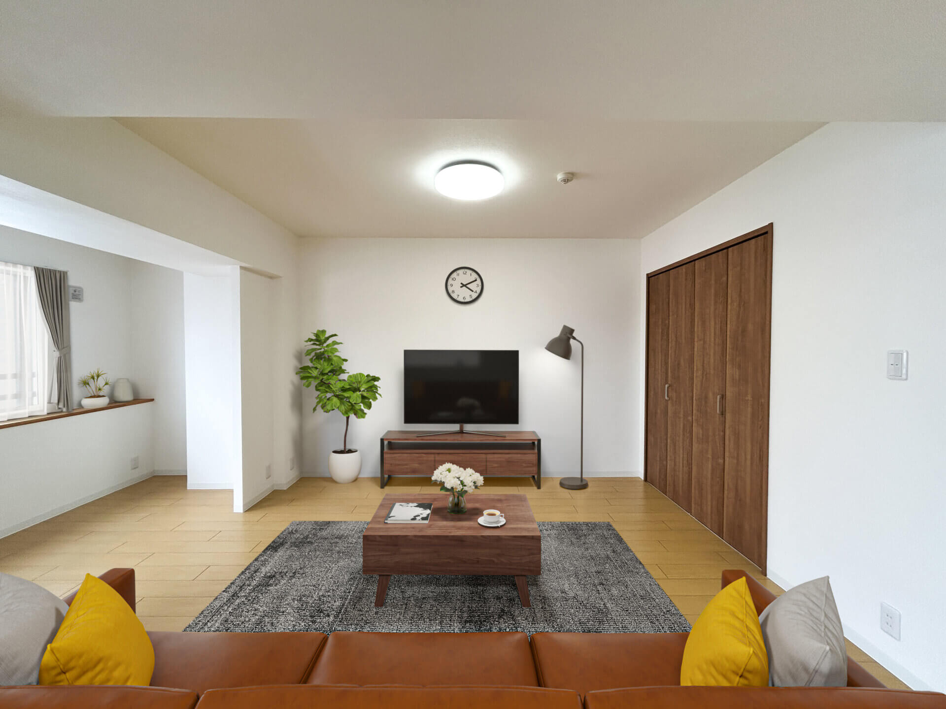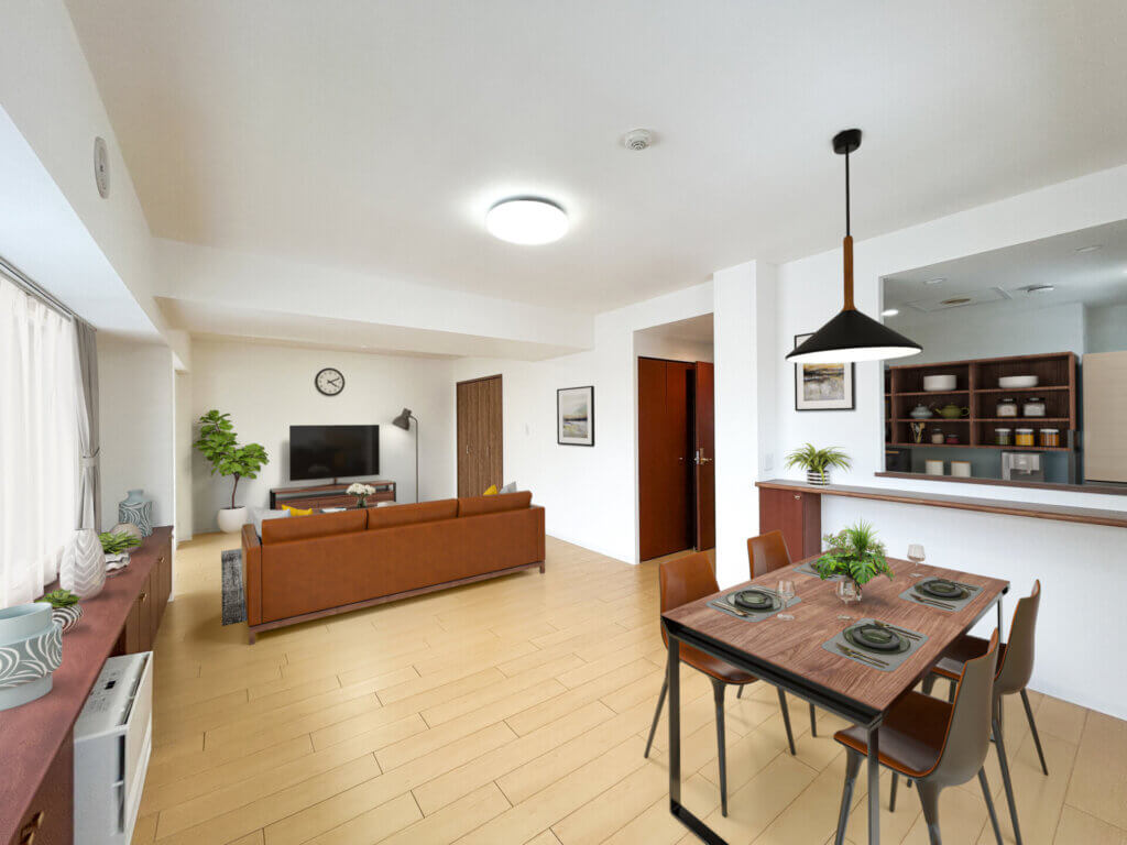 キッチンからリビングまで見渡せる開放的なレイアウトにこだわりました。落ち着いた木目調のフローリングと、アクセントとなるダークトーンの建具で空間に奥行きと高級感を演出しています。キッチンや浴室などの水回りも最新設備へ入れ替え、家事動線とデザイン性を両立しました。