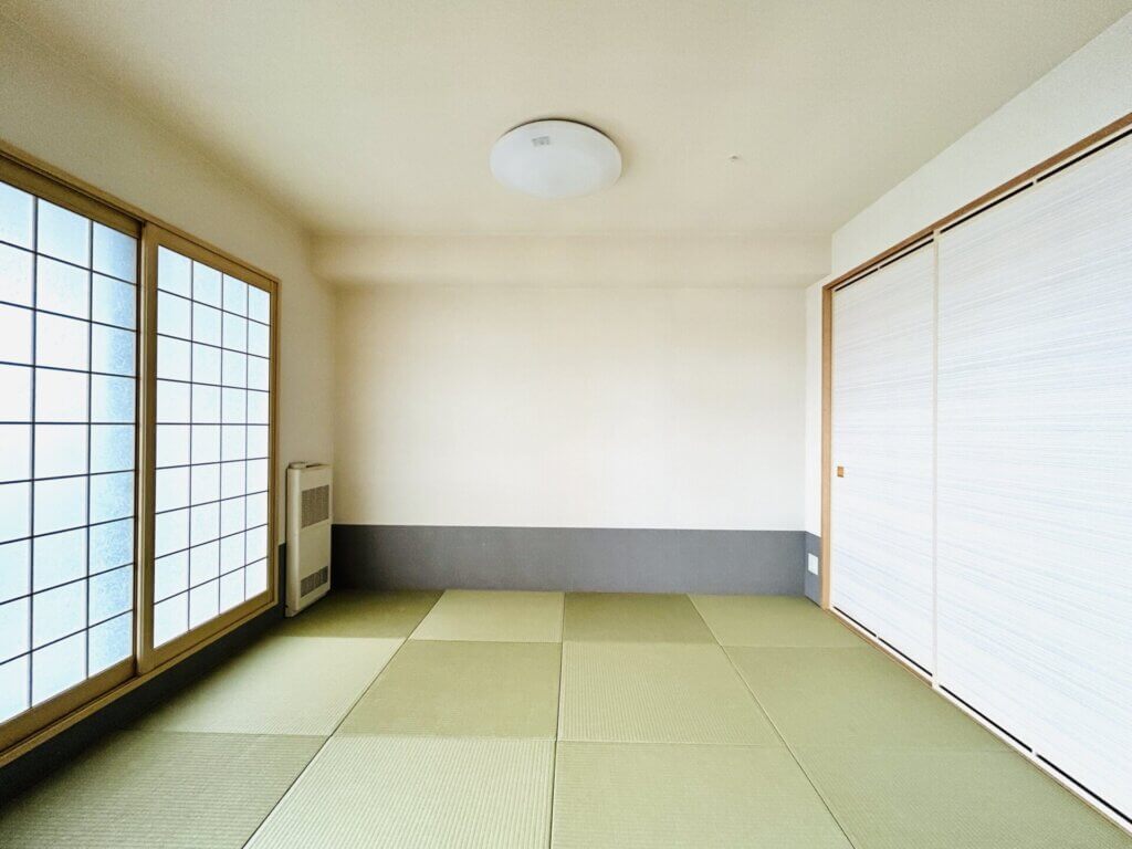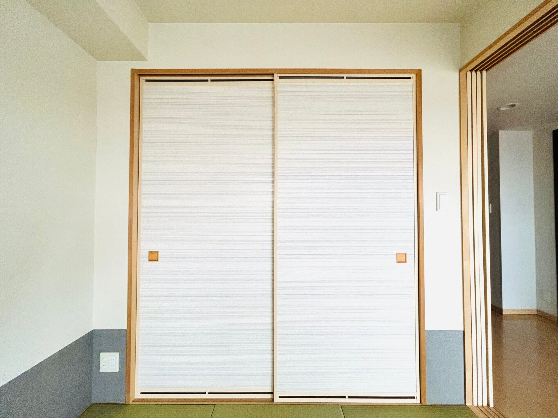 もともと和室だった空間を、ライフスタイルに合わせてリビングへリフォームしました。TVボード背面には石調のアクセントウォールを採用し、上質で落ち着いた印象に。木目の建具と淡いフローリングで統一感を持たせ、明るくあたたかみのある空間に仕上げました。