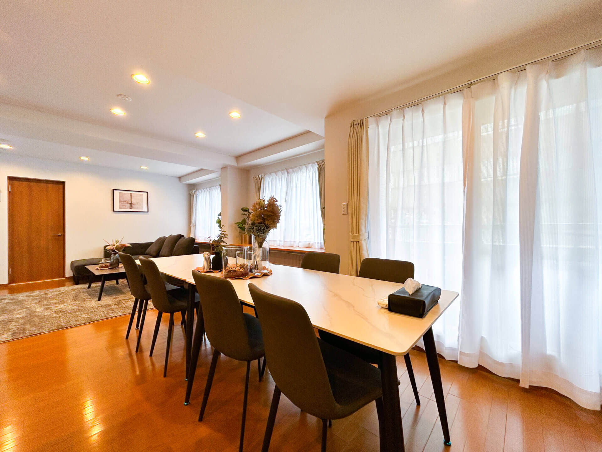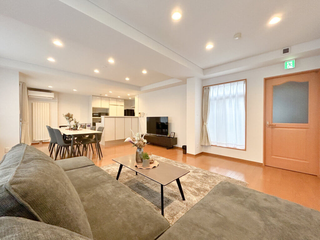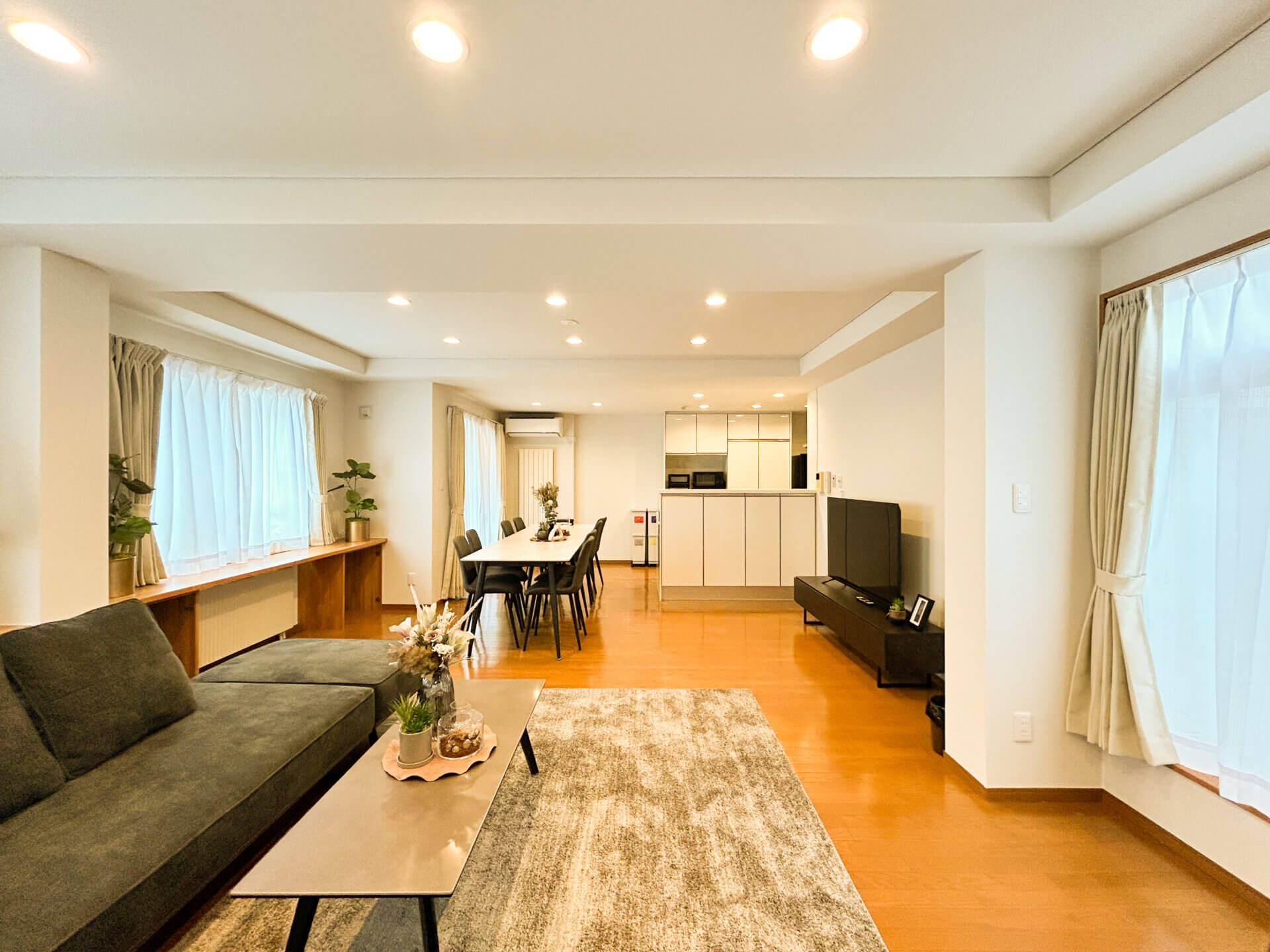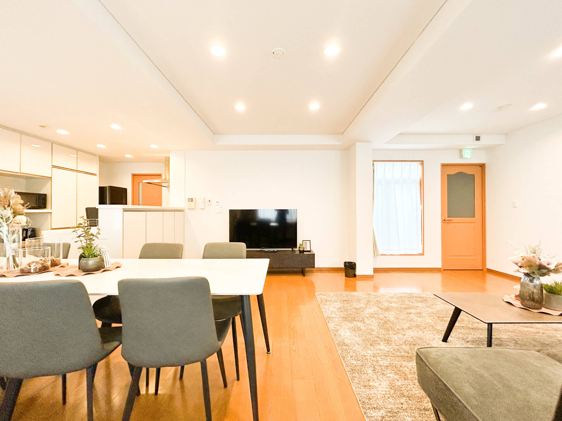 既存のビル一室を民泊仕様にリノベーションいたしました。広々としたLDK空間を活かし、インテリアコーディネートでホテルライクな空間に。温かみのある木目とモノトーンを基調に、家具や照明で統一感を演出しました。日差しを柔らかく取り込むカーテンや観葉植物で、明るく心地よいリビングに仕上がっています。
