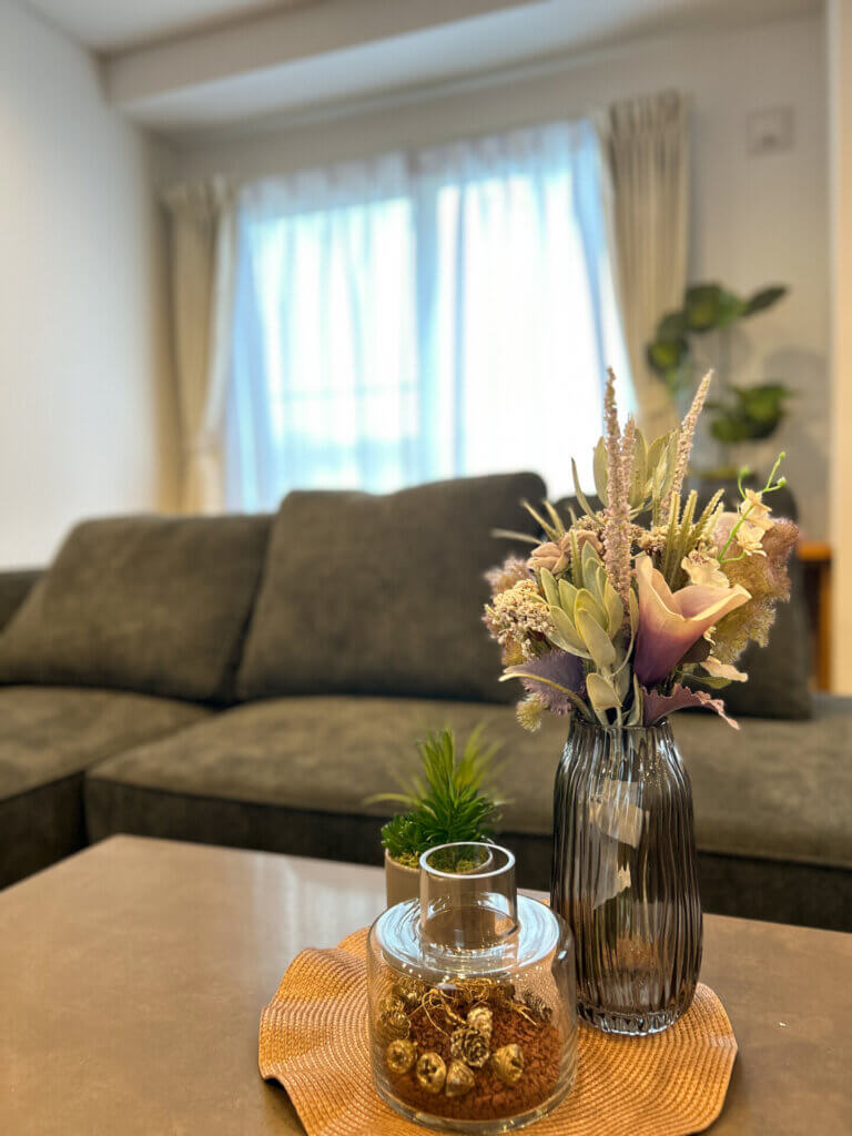 もともと明るく開放的なお部屋でしたが、家具の配置と照明計画でより居心地の良い空間に生まれ変わりました。広い空間に合わせたサイズ感の家具でゆったりとご宿泊いただけます。民泊・宿泊施設向けの空間設計も承りますので、ぜひお気軽にご相談ください!